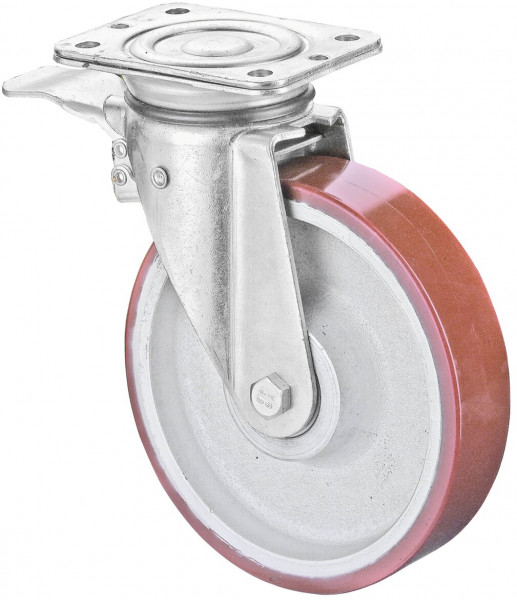 Zwaarlastwiel N120.C10.203, Soort product: Zwenkwielen met totale vergrendeling, Bevestiging: Aanschroefplaat, Ø Schroefgat: 11 mm, Wielkern: Gietijzer, Loopvlak: Prothane® gegoten polyurethaan 95 +/- 3 Shore A, Lager: Kogellagers, Ø Wiel: 200 mm, Draagvermogen: 600 kg